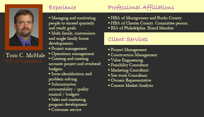 Over the past thirty years Tom McHale has built over 2,500 dwelling units consisting of single family homes, multi family homes, commercial buildings and full building conversions into commercial and residential space.